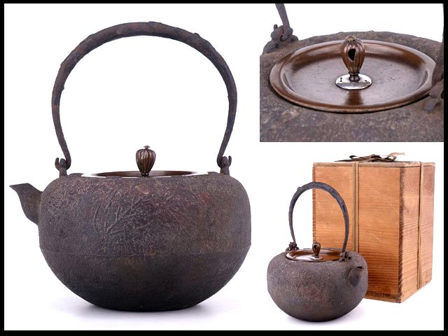 鉄瓶 大日本釜師長 御釜師 名越弥五郎 丸形 唐銅蓋 宣徳釣 共箱